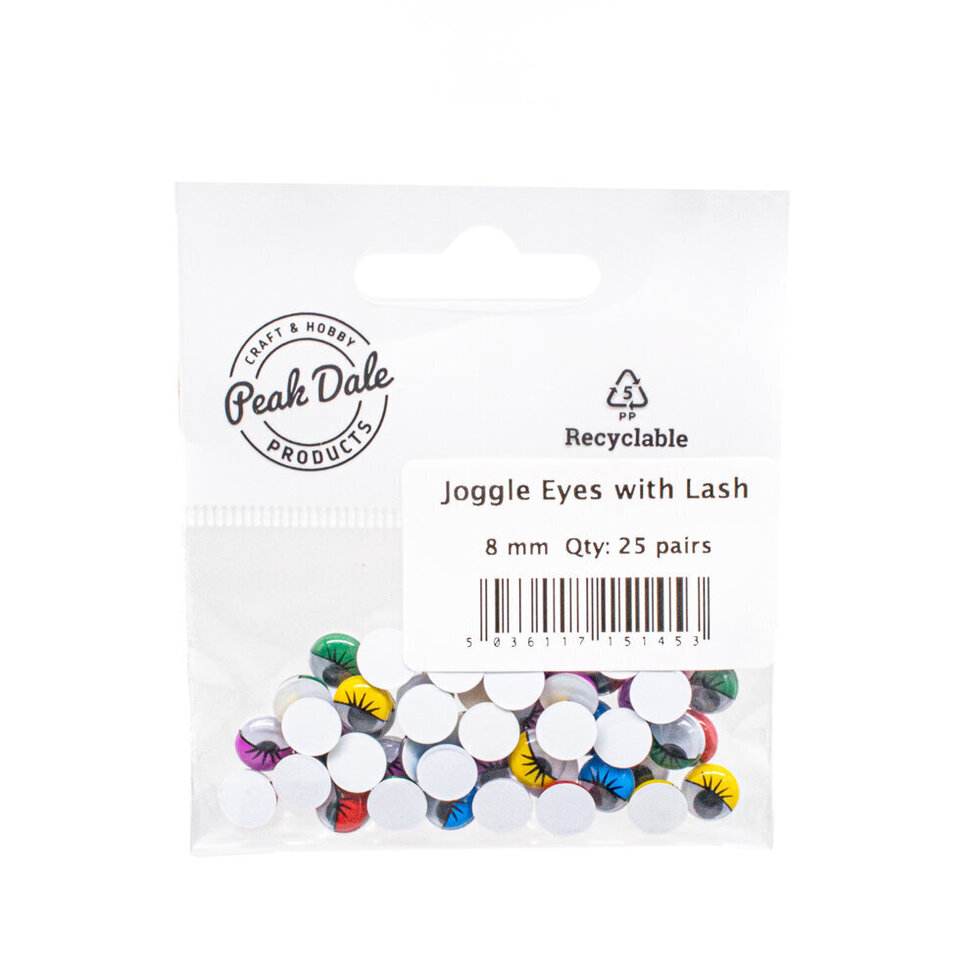 Coloured joggle or wiggle eyes with Lashes 8mm round use glue to attach. Pack contains 25 pairs