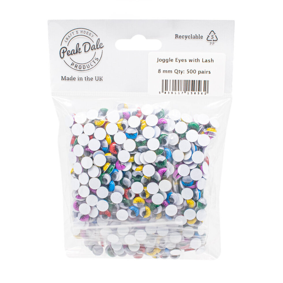 Coloured Joggle, google, wiggle eyes with Lashes 8mm round glue on. Pack contains 500 pairs