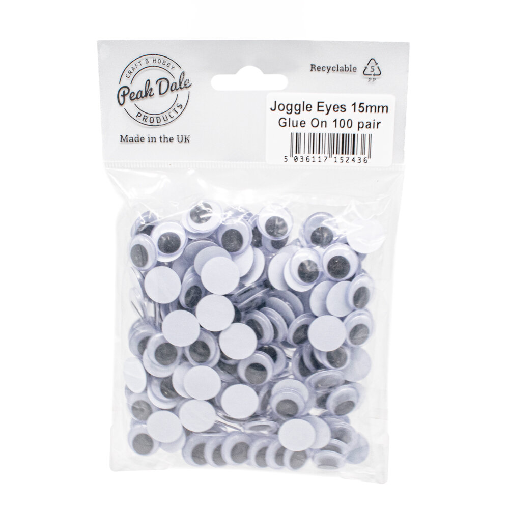 Joggle eyes also known as googly or wiggle eyes. 15mm round with a black pupil, glue on to cardboard, wood, etc. Not designed for young childrens toys, bag of 100 pairs.