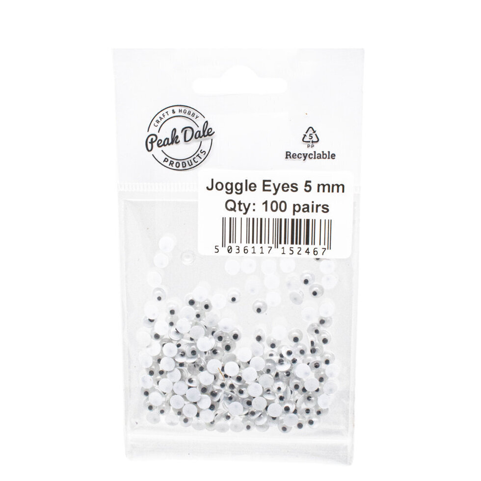 Joggle eyes also known as googly or wiggle eyes. 5mm round with a black pupil, glue on to cardboard, wood, etc. Not designed for young childrens toys, bag of 100 pairs.