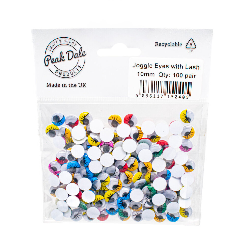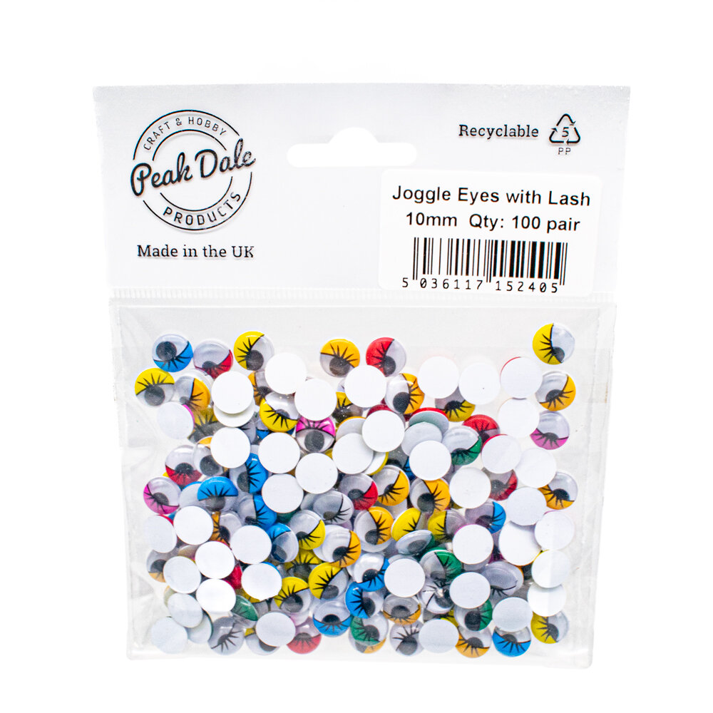 Joggle eyes also known as googly or wiggle eyes. 10mm round with lash and a black pupil, glue on to cardboard, wood, etc. Not designed for young childrens toys, bag of 100 pairs.