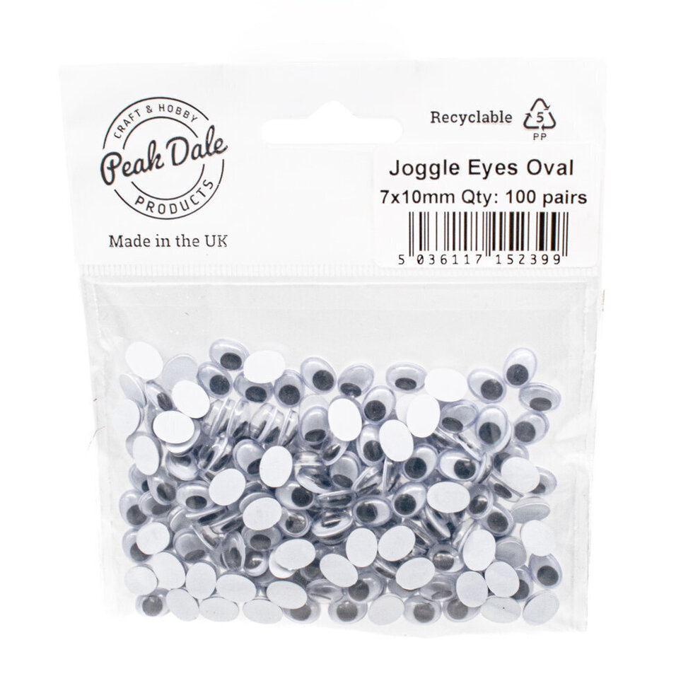 Joggle eyes also known as googly or wiggle eyes. Oval 7 x 10mm round with a black pupil, glue on to cardboard, wood, etc. Not designed for young childrens toys, bag of 100 pairs.