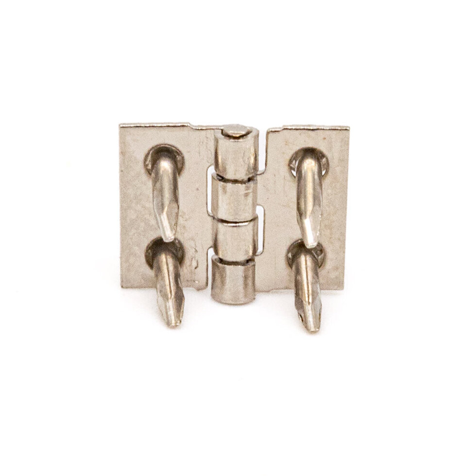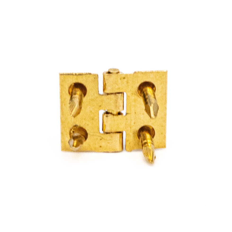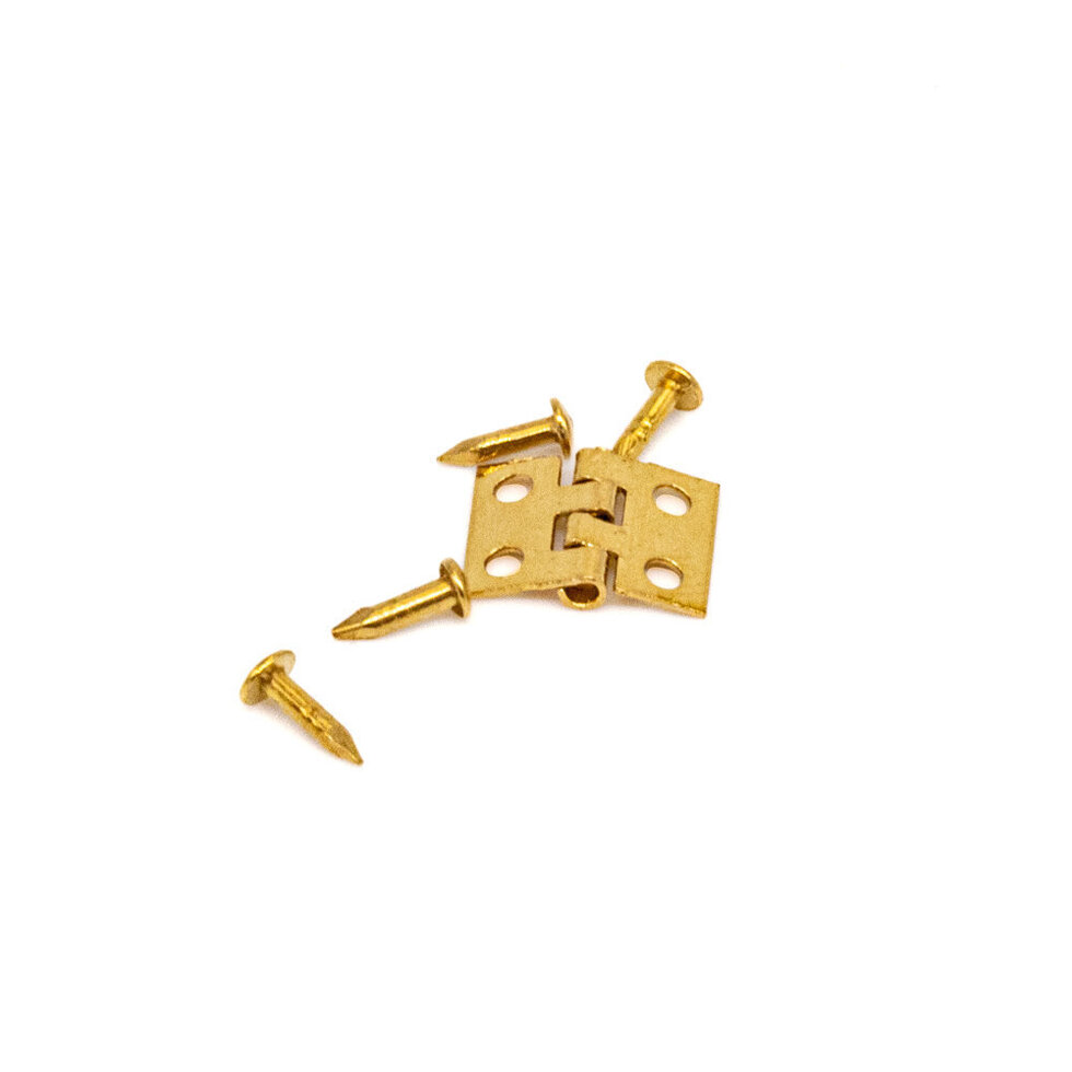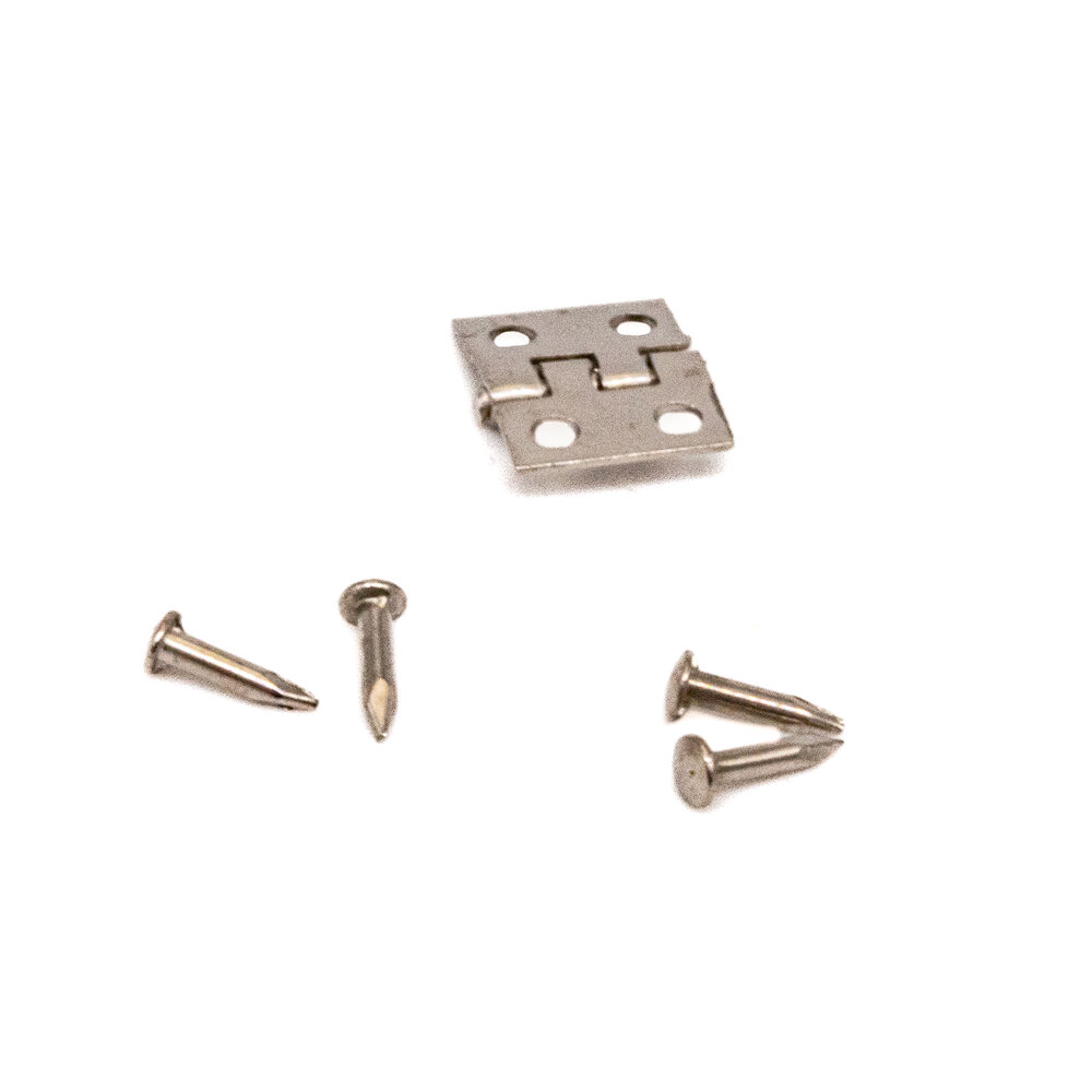 Very small butt hinges, for small boxes, dollshouses, etc. size: 8mm high. Pack contains 8 hinges and pins to fix, 4 silver and 4 brass