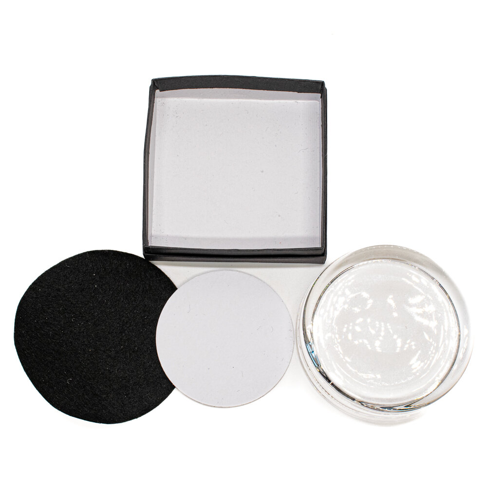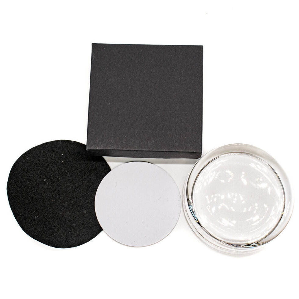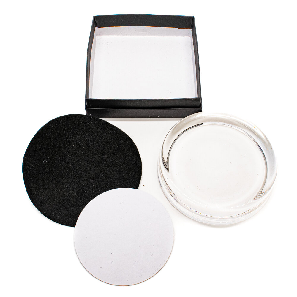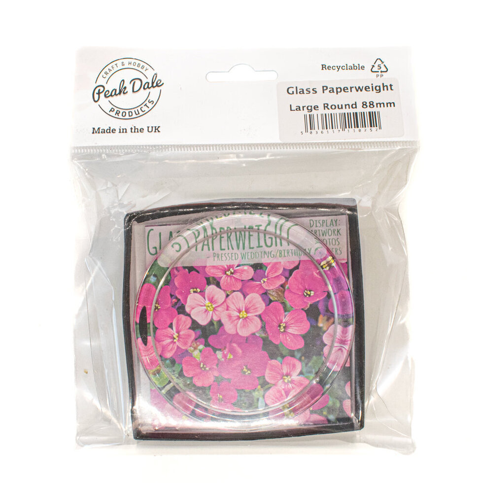 Good quality glass paperweight blank for you to insert your own photgraph or artwork in the recess at the bottom. The large round measures 88mm diameter, the insert is 73mm dia, 2mm deep. Complete in eco friendly box, self ahesive felt and instructions.