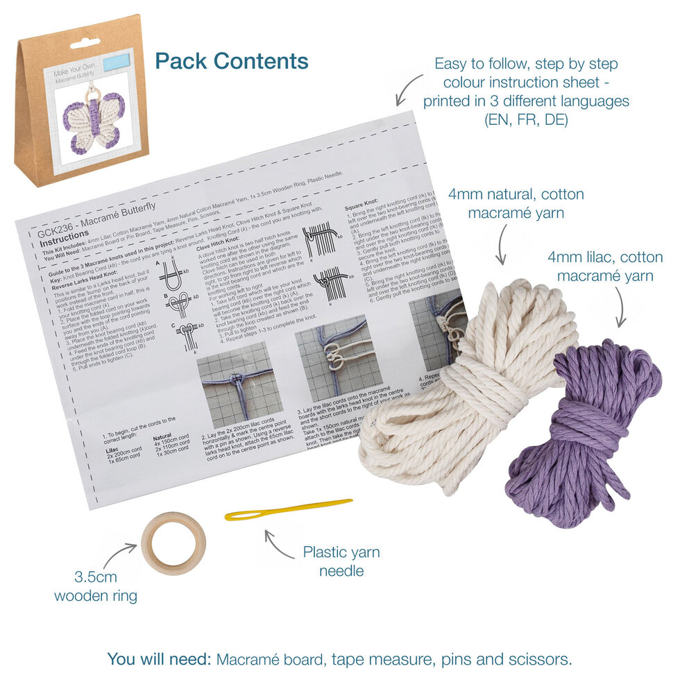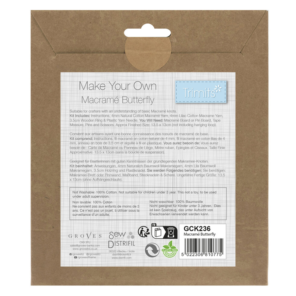 Butterfly macram kit. The kit contains everything you need to complete your project and your finished decoration will make a perfect home accessory or a unique gift. Kit includes: Cotton Macram yarns; 3.5cm wooden craft ring; 1 x wooden bead and instructions in EN/FR/DE with link to video instructions. You will need: Macram board or pin board; tape measure; pins and scissors. Approximate finished size of design: (w/h) 13.5 x 13cm. Hand wash in cold or warm water, with a gentle detergent. Do not dry clean or tumble dry.