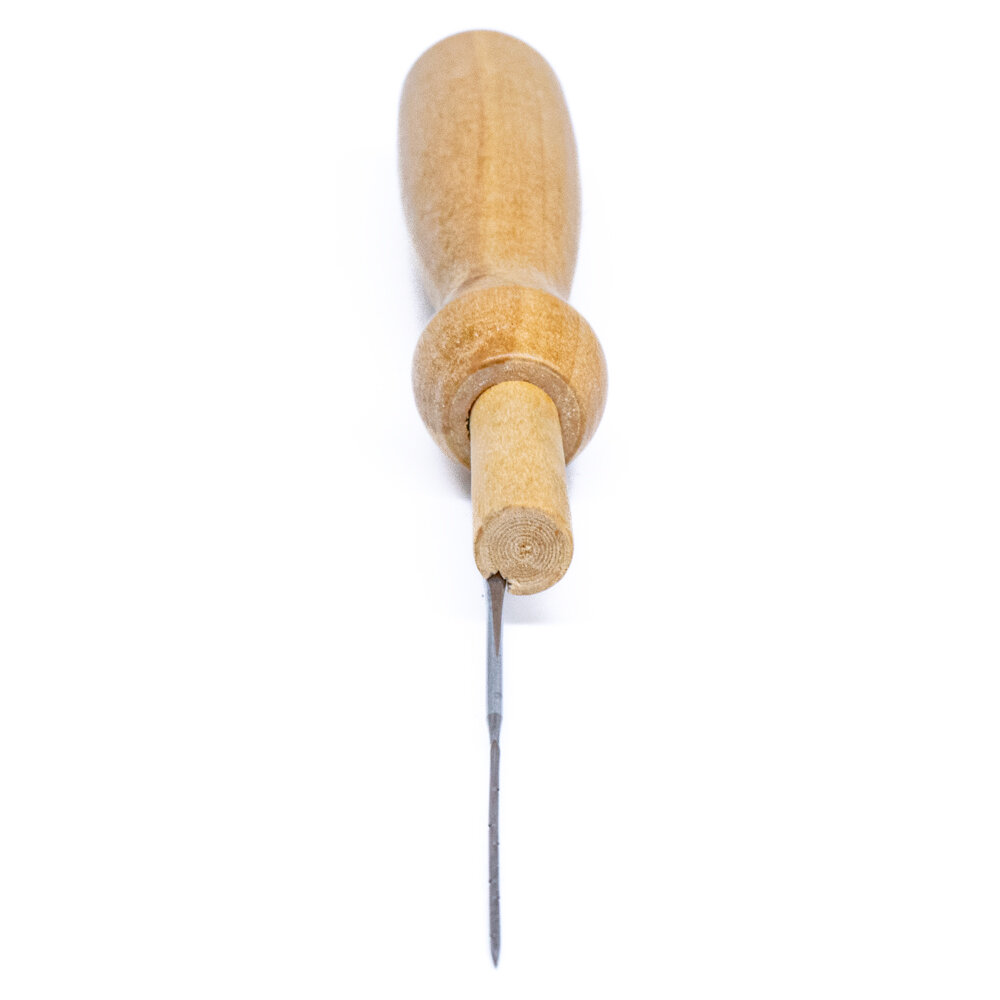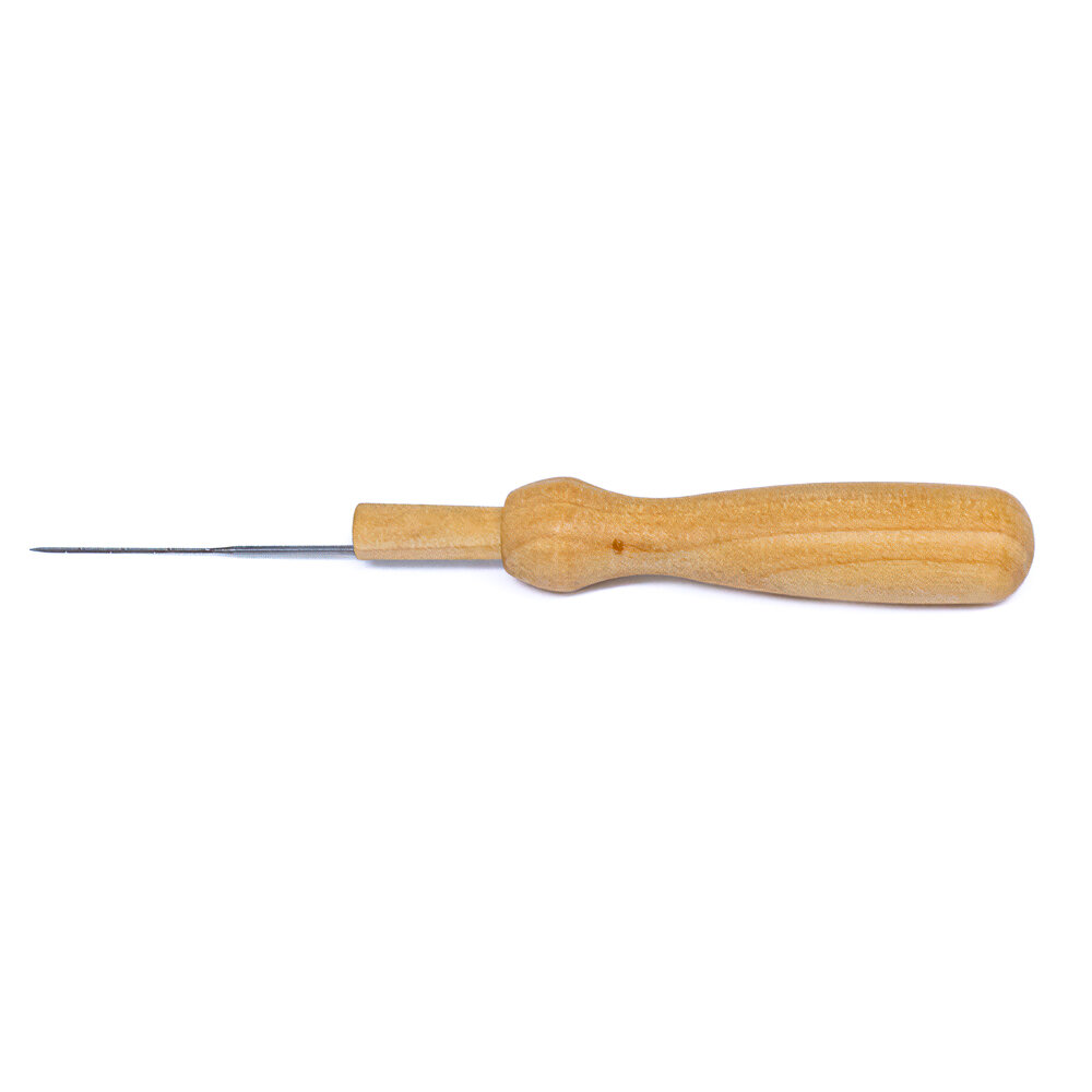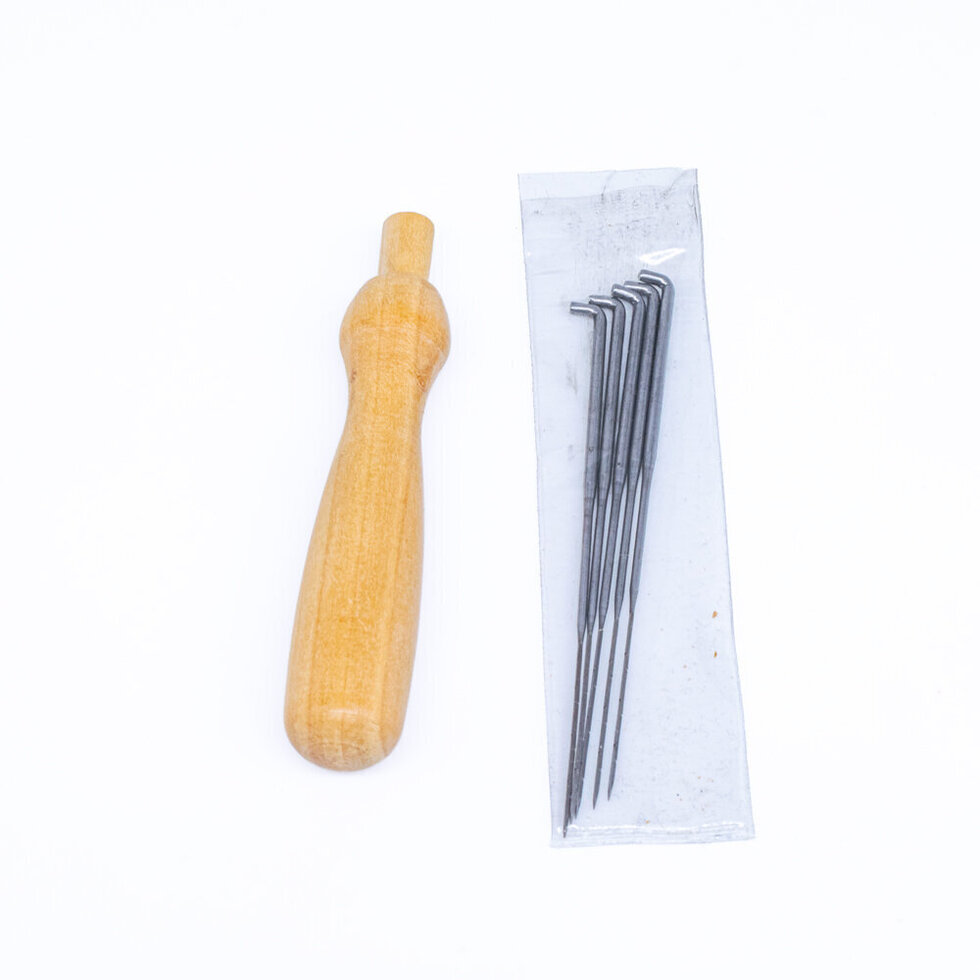 A set of 5 medium felting needles with a wooden handle holder