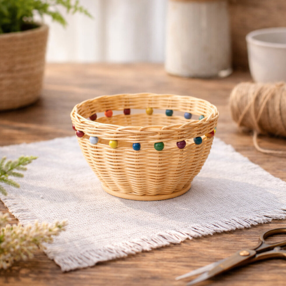 Create a charming handmade basket while learning the fundamentals of traditional basket weaving with this Basketry Kit Basket with Beads. This engaging project guides you through making a small round basket, finished with colourful wooden beads woven neatly into the rim for added character and visual interest.
