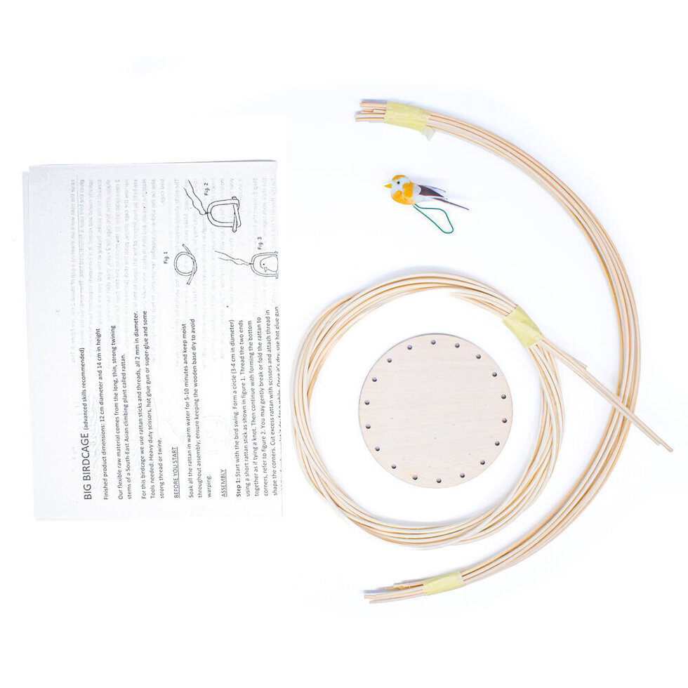 Create a striking decorative piece while learning traditional basket-making techniques with this Basketry Kit Big Birdcage. This engaging project guides you through weaving a freestanding birdcage shape using natural rattan cane, finished with a small decorative bird for added charm.