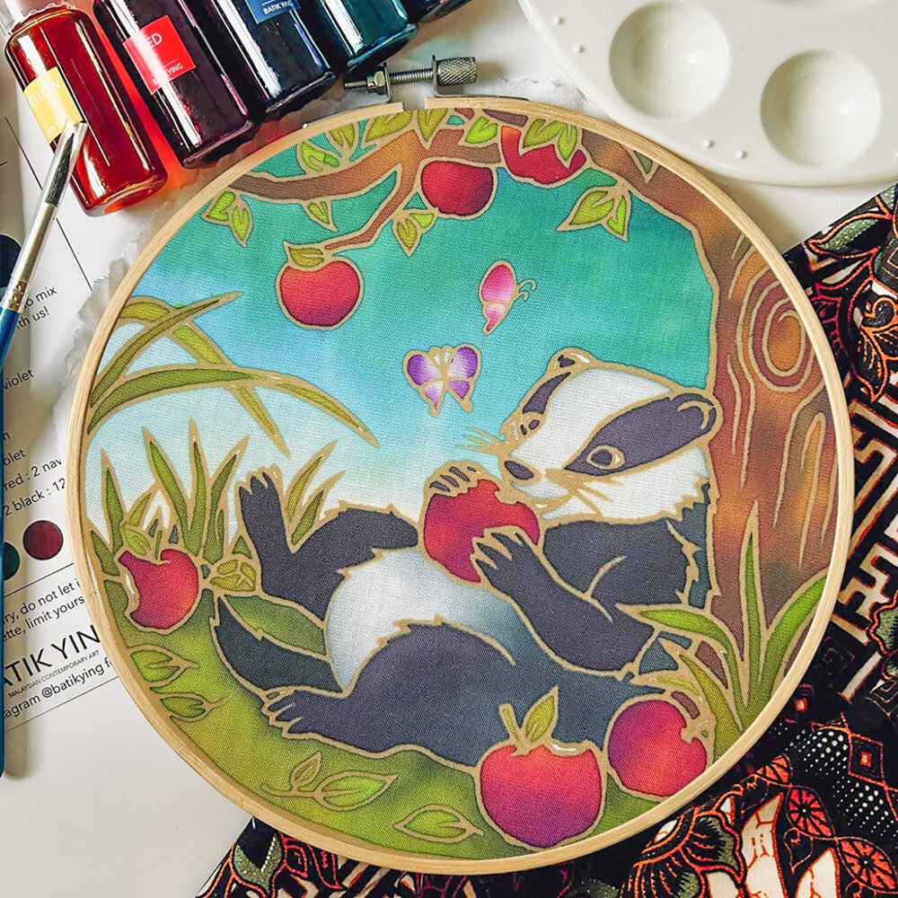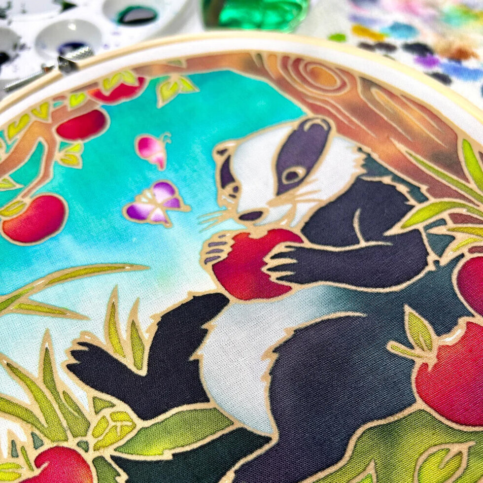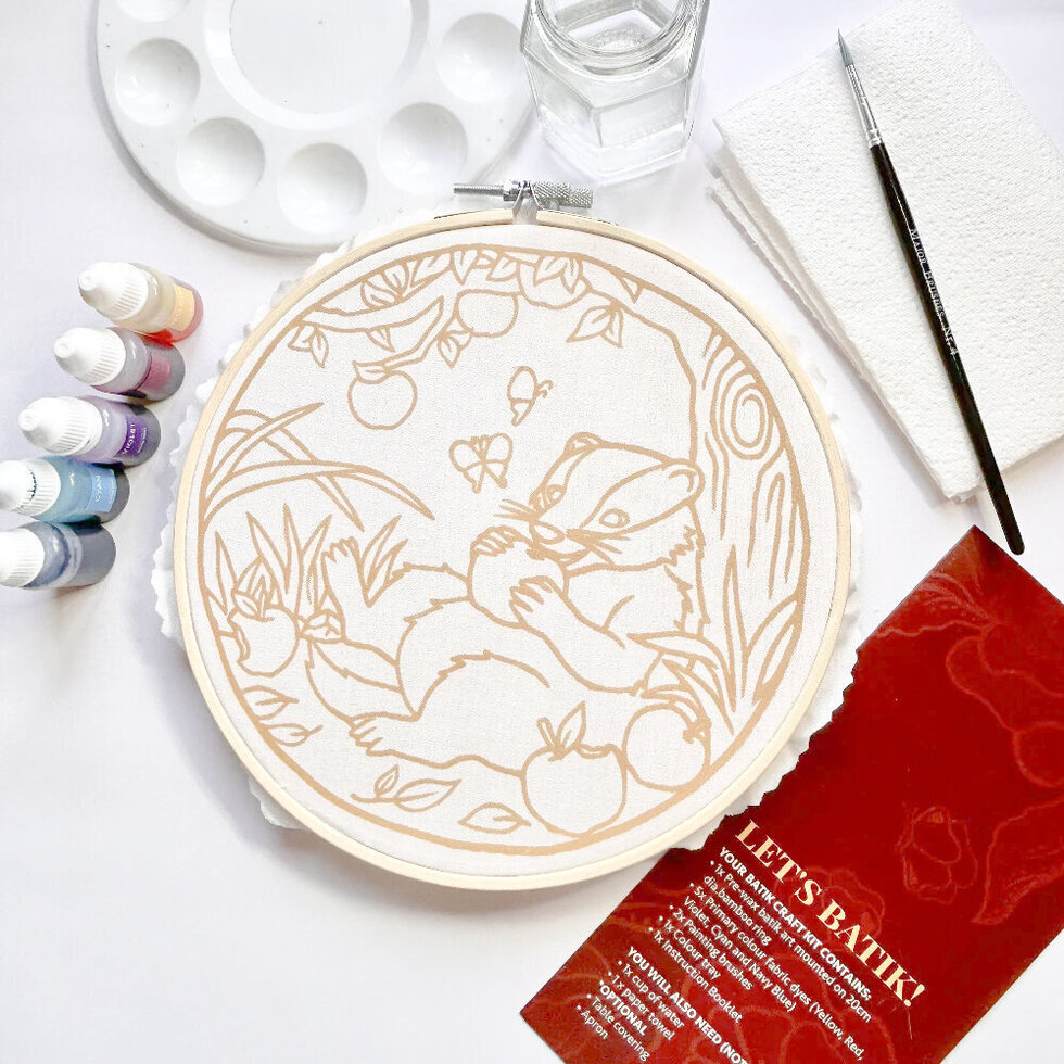 Designed for beginners and craft lovers alike, the fabric comes pre-waxed, with the intricate batik outlines already applied. This removes the most technical part of traditional batik, allowing you to focus entirely on adding colour. As you apply the dyes, the wax resists the paint to reveal sharp lines and strong, high-contrast effects—perfect for bringing out the badger’s distinctive markings.